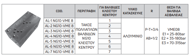 | AL-1 NG10-VME 8 | Multiple NG 10 – VME8 Valves Manifold, Closed center | 1 | ΑLUMINIUM | P-T=3/4 AB=1/2 | VME08 E1 = 25-80bar E2 = 35-180bar E3 = 70-315bar |