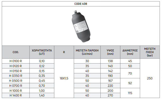 | COD. | ΧΩΡΗΤΙΚΟΤΗΤΑ (LIT) | R | ΜΕΓΙΣΤΗ ΠΑΡΟΧΗ (Lit/min) | ΥΨΟΣ (mm) | ΔΙΑΜΕΤΡΟΣ (mm) | ΜΕΓΙΣΤΗ ΠΙΕΣΗ (bar) |
