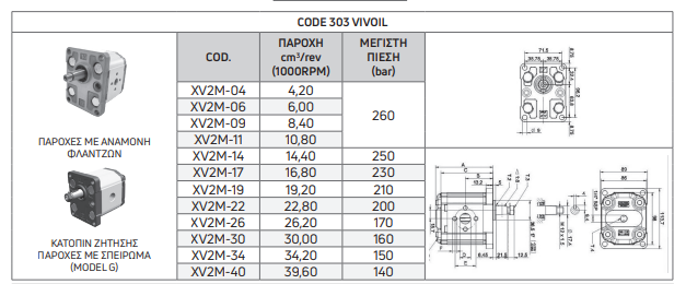 | COD. | ΠΑΡΟΧΗ cm^{3} /rev (1000RPM) | ΜΕΓΙΣΤΗ ΠΙΕΣΗ (bar) |