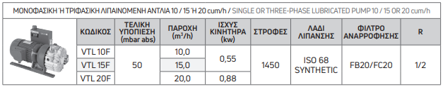 | ΚΩΔΙΚΟΣ | ΤΕΛΙΚΗ ΥΠΟΠΙΕΣΗ (mbar abs) | ΠΑΡΟΧΗ (m^{3} /h) | ΙΣΧΥΣ ΚΙΝΗΤΗΡΑ (kw) | ΣΤΡΟΦΕΣ | ΛΑΔΙ ΛΙΠΑΝΣΗΣ | ΦΙΛΤΡΟ ΑΝΑΡΡΟΦΗΣΗΣ | R |