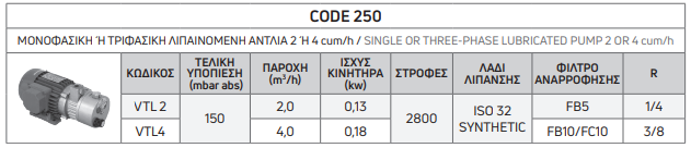 | ΚΩΔΙΚΟΣ | ΤΕΛΙΚΗ ΥΠΟΠΙΕΣΗ (mbar abs) | ΠΑΡΟΧΗ (m^{3} /h) | ΙΣΧΥΣ ΚΙΝΗΤΗΡΑ (kw) | ΣΤΡΟΦΕΣ | ΛΑΔΙ ΛΙΠΑΝΣΗΣ | ΦΙΛΤΡΟ ΑΝΑΡΡΟΦΗΣΗΣ | R |