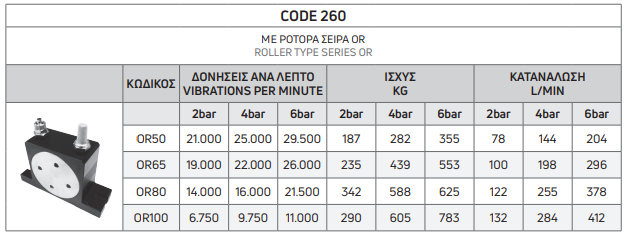 | ΚΩΔΙΚΟΣ | ΔΟΝΗΣΕΙΣ ANA ΛΕΠΤΟ VIBRATIONS PER MINUTE | ΙΣΧΥΣ KG | ΚΑΤΑΝΑΛΩΣΗ L/MIN | ||||||
