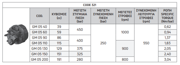 | COD. | ΚΥΒΙΣΜΟΣ (cc) | ΜΕΓΙΣΤΗ ΣΤΙΓΜΙΑΙΑ ΠΙΕΣΗ (bar) | ΜΕΓΙΣΤΗ ΣΥΝΕΧΟΜΕΝΗ ΠΙΕΣΗ (bar) | ΜΕΓΙΣΤΕΣ ΣΤΡΟΦΕΣ (rpm) | ΣΥΝΕΧΟΜΕΝΗ ΛΕΙΤΟΥΡΓΙΑ ΣΤΡΟΦΕΣ (rpm) | ΡΟΠΗ SPECIFIC TORQUE (Nm/bar) |