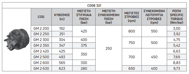 | COD. | ΚΥΒΙΣΜΟΣ (cc) | ΜΕΓΙΣΤΗ ΣΤΙΓΜΙΑΙΑ ΠΙΕΣΗ (bar) | ΜΕΓΙΣΤΗ ΣΥΝΕΧΟΜΕΝΗ ΠΙΕΣΗ (bar) | ΜΕΓΙΣΤΕΣ ΣΤΡΟΦΕΣ (rpm) | ΣΥΝΕΧΟΜΕΝΗ ΛΕΙΤΟΥΡΓΙΑ ΣΤΡΟΦΕΣ (rpm) | ΡΟΠΗ SPECIFIC TORQUE (Nm/bar) |