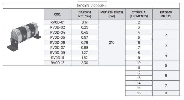 | COD. | ΠΑΡΟΧΗ (cm^{3} /rev) | ΜΕΓΙΣΤΗ ΠΙΕΣΗ (bar) | ΣΤΟΙΧΕΙΑ (ELEMENTS) | ΕΙΣΟΔΟΙ INLETS |