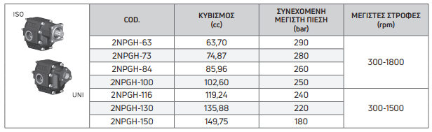 | COD. | ΚΥΒΙΣΜΟΣ (cc) | ΣΥΝΕΧΟΜΕΝΗ ΜΕΓΙΣΤΗ ΠΙΕΣΗ (bar) | ΜΕΓΙΣΤΕΣ ΣΤΡΟΦΕΣ (rpm) |