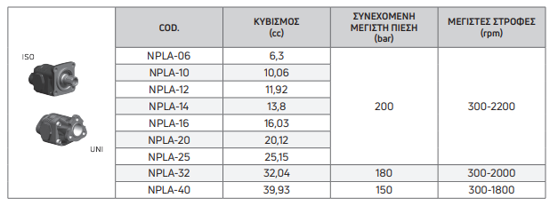 | COD. | ΚΥΒΙΣΜΟΣ (cc) | ΣΥΝΕΧΟΜΕΝΗ ΜΕΓΙΣΤΗ ΠΙΕΣΗ (bar) | ΜΕΓΙΣΤΕΣ ΣΤΡΟΦΕΣ (rpm) |