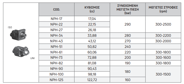 | COD. | ΚΥΒΙΣΜΟΣ (cc) | ΣΥΝΕΧΟΜΕΝΗ ΜΕΓΙΣΤΗ ΠΙΕΣΗ (bar) | ΜΕΓΙΣΤΕΣ ΣΤΡΟΦΕΣ (rpm) |