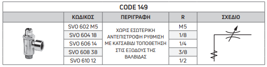 | SVO 602 M5 | ΧΩΡΙΣ ΕΣΩΤΕΡΙΚΗ ΑΝΤΕΠΙΣΤΡΟΦΗ ΡΥΘΜΙΣΗ ΜΕ ΚΑΤΣΑΒΙΔΙ ΤΟΠΟΘΕΤΗΣΗ ΣΤΙΣ ΕΞΟΔΟΥΣ ΤΗΣ ΒΑΛΒΙΔΑΣ | M5 |